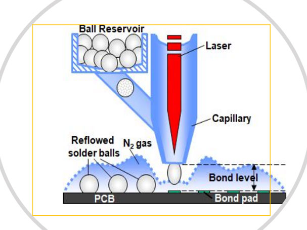 采用激光加熱錫球,并通過一定的壓力噴射到需要植球鍵合位置,是一種 新型植球技術(shù)。具有非接觸、無釬劑、熱量小、釬料精確可控等優(yōu)點(diǎn)。